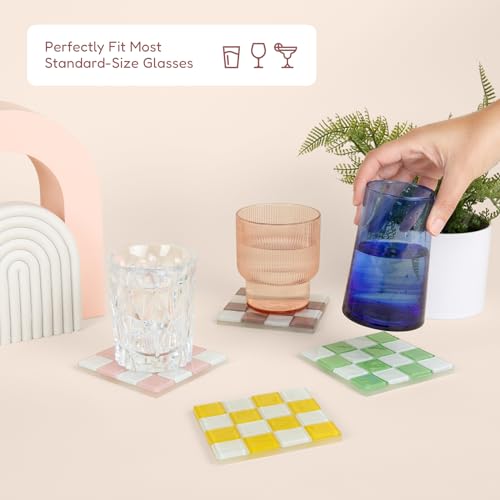 STYLISH SURFACE PROTECTION – these colourful glass checkered coasters are a tiktok pattern that double as daring room decor; for kitchens, bogs, espresso bars and extra. the colourful tiled design protects tables from drink rings whereas lending retro aptitude as cute jewellery trays or dishes. Hold surfaces pristine with useful but trendy coasters.